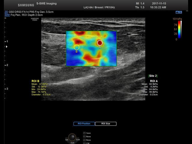 • Модуль S-Shearwave imaging – программа цветовой сдвиговой эластографии позволяющая автоматически определять индекс жесткости различных участков исследуемого объекта в кПа или м/с, получая при это еще и индекс достоверности данных RMI.