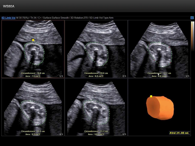 - Пакет опций 5D (5D Heart, 5D CNS, 5D NT, 5D LB, 5D Follicle, 5D Limb Vol) - позволяет вывести наиболее значимые проекции структур мозга, сердца плода, а также длинные кости плода при выставлении нескольких маркерных точек и провести в объеме необходимые измерения автоматически.