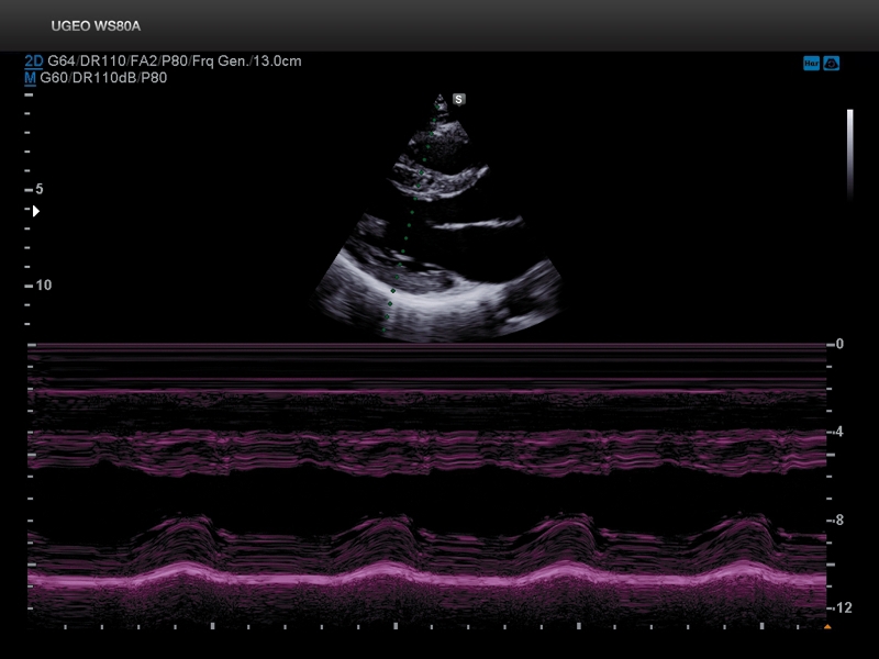 М-режим: измерение диаметра аорты, передне-заднего размера ЛП, толщины МЖП (систолическая и диастолическая), толщины ЗСЛЖ (систолическая и диастолическая), размеров ЛЖ и ПЖ (систолический и диастолический), ФВ (Teichholz).