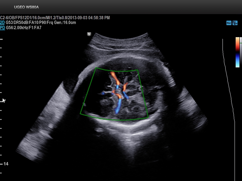 - Сердце плода: измерения в В-режиме (отношение площади сердца и грудной клетки), измерения в М-режиме (толщина межжелудочковой перегородки в диастолу, конечнодиастолический размер левого желудочка, толщина задней стенки левого желудочка в диастолу, толщина межжелудочковой перегородки в систолу, размер левого желудочка в систолу, толщина задней стенки левого желудочка в систолу, внутренний размер правого желудочка в диастолу), измерения в режиме спектрального допплера (легочный ствол, артериальный проток, нижняя полая вена, венозный проток, восходящая аорта, нисходящая аорта, трансмитральный кровоток, митральная регургитация, трикуспидальный кровоток, трикуспидальная регургитация, индекс преднагрузки, ЧСС).