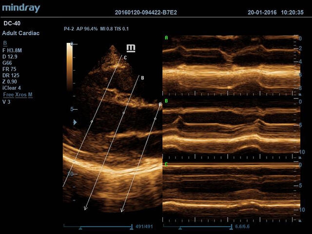 • Free Xros M™ - анатомический М-режим - это возможность вращения курсора в М-режиме под произвольным углом (при фиксированном положении датчика) и, соответственно, получения графика движения структур сердца в различных произвольных плоскостях.